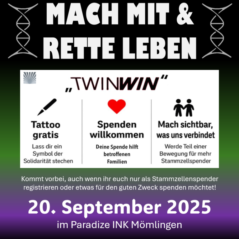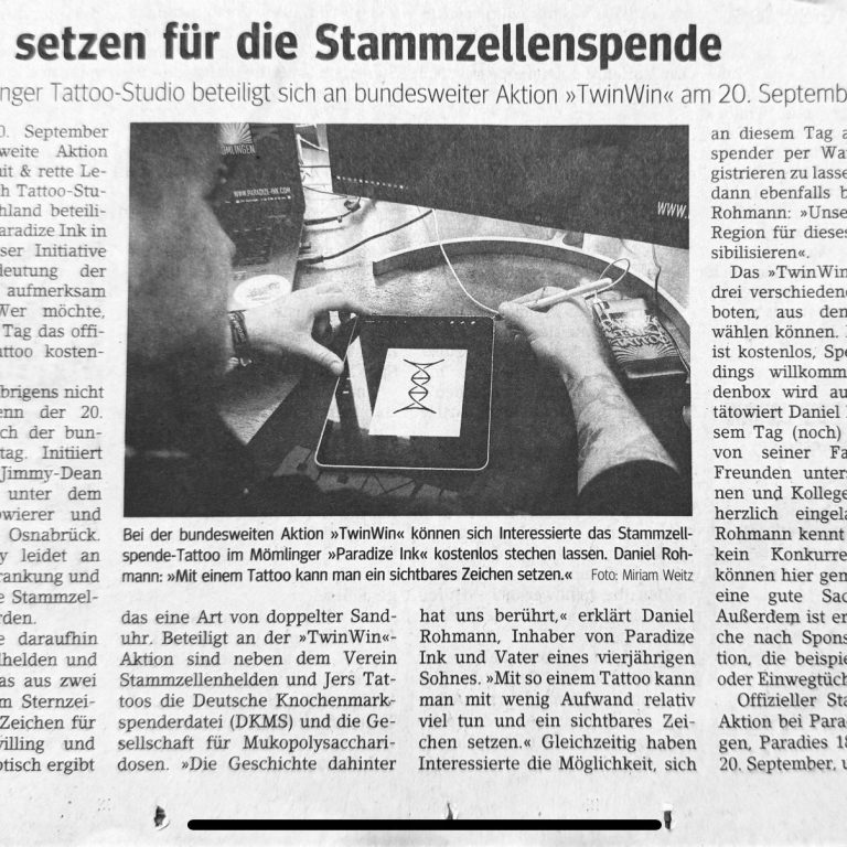 Am 20. September 2025 beteiligt sich Paradize INK an einer bundesweiten Aktion, die Leben retten kann. Unter dem Titel „TwinWin“ öffnen wir ab 11 Uhr unsere Türen und sind eines von 250 Tattoo-Studios in ganz Deutschland, die gemeinsam auf das wichtige Thema Stammzellspende aufmerksam machen...