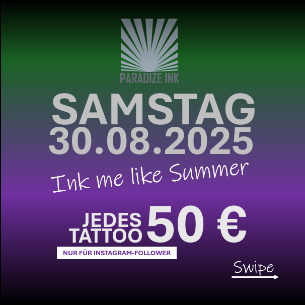 Am Samstag, den 30. August 2025, stand bei Paradize Ink alles unter dem Motto „Ink me like Summer“. Für nur 50 € pro Tattoo (exklusiv für Instagram-Follower) konnten sich unsere Besucher eines von 36 sommerlichen Motiven stechen lassen – und das Angebot wurde begeistert angenommen. Ein Video mit ein paar Impressionen findet ihr in diesem Beitrag...