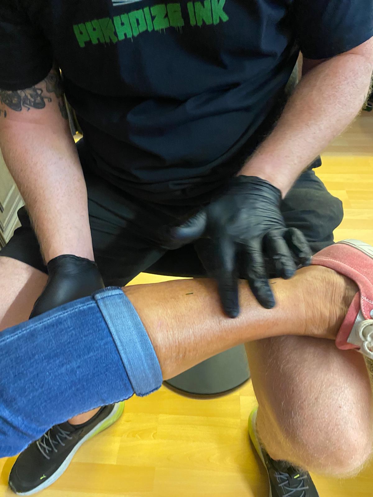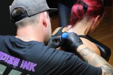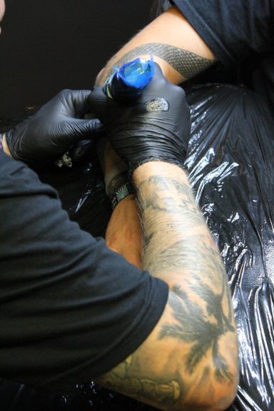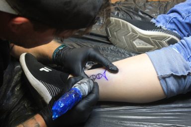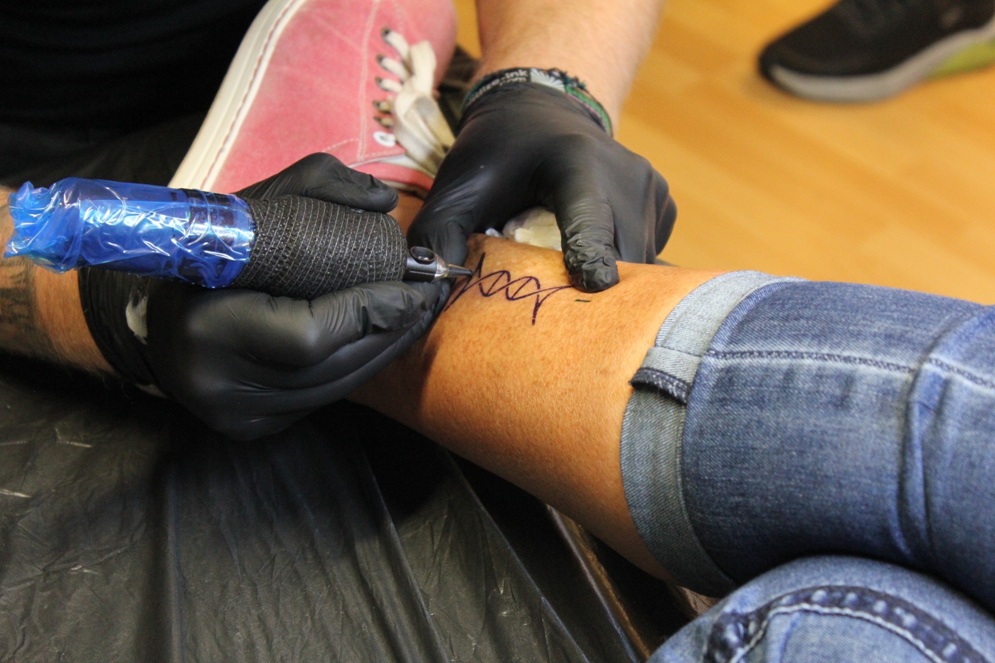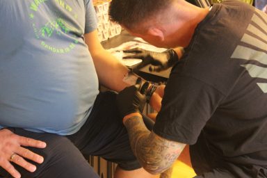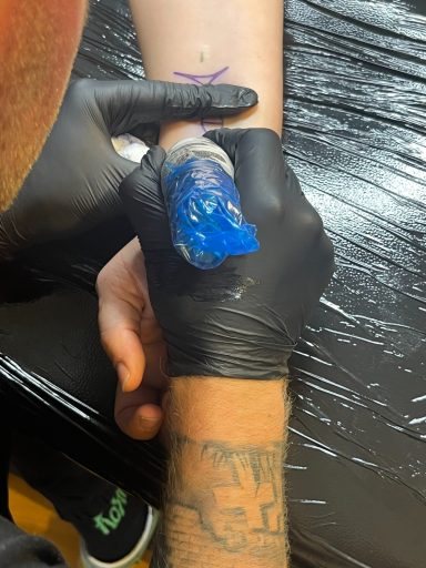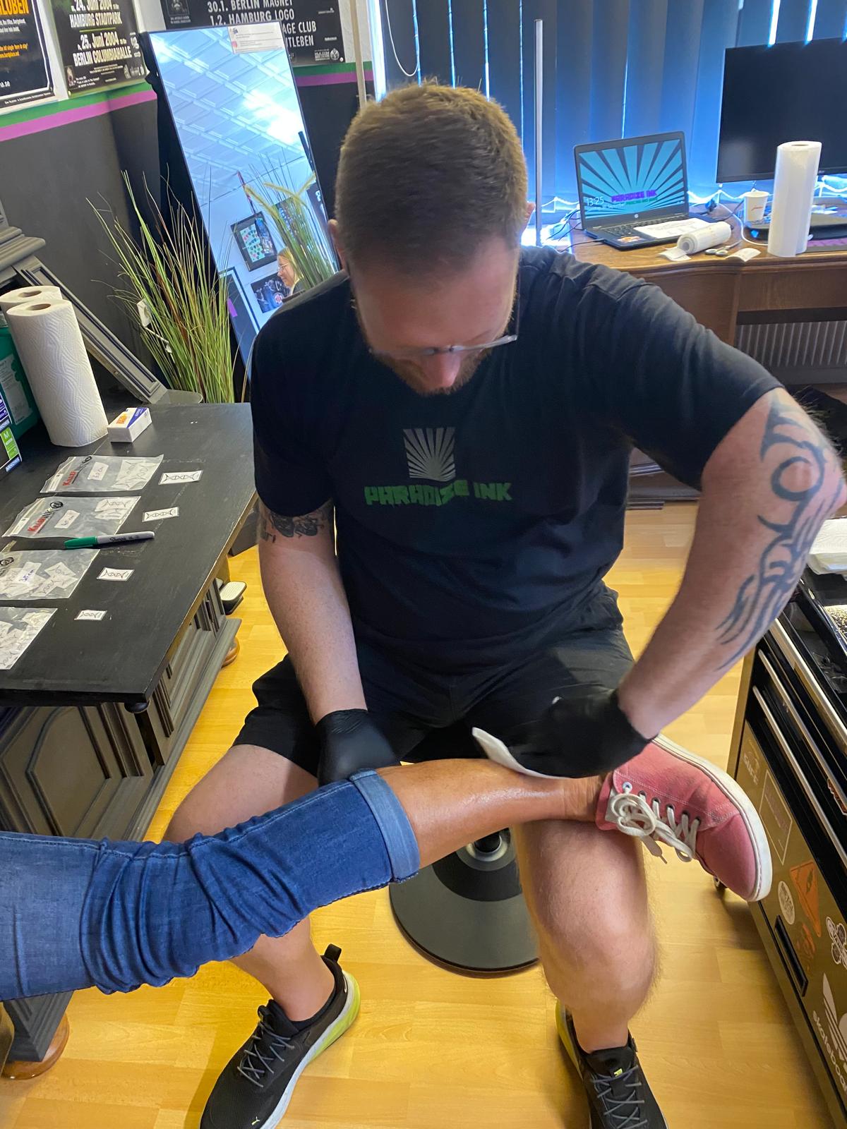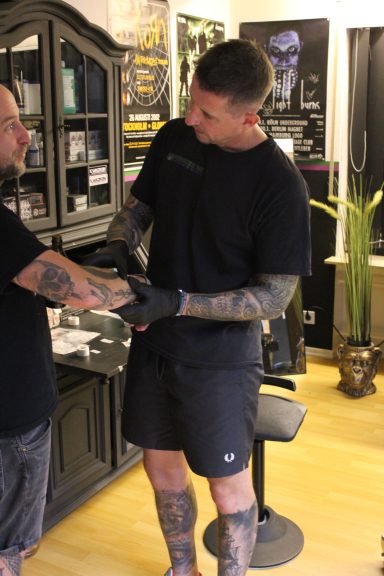 Claudi, unterstützt von Lena und Susanne – unsere Orga-Queens, die Besucherströme gelenkt, Fragen beantwortet, Listen geführt und mit beeindruckender Ruhe und Übersicht den Tag zusammengehalten haben. „Wenn Chaos anklopft, macht Claudi einfach nicht auf.“ – sie hat wirklich alles im Griff gehabt und mit Leidenschaft koordiniert. Jörg und Pidi – die mit perfekter Präzision wunderschöne Stencils gesetzt und unserem Tätowierer Daniel zugearbeitet haben. Familie Weis – die sich mit Herzblut um die Typisierungsstation gekümmert und so maßgeblich zu den 19 Registrierungen beigetragen haben. Michael, unser Fotograf – der all die besonderen Augenblicke dieses Tages festgehalten hat und dem Event ein Gesicht gegeben hat. Und nicht zu vergessen: Die letzten Helfer waren erst um 2 Uhr nachts wieder zuhause. Ein langer, intensiver Tag – aber absolut lohnenswert.